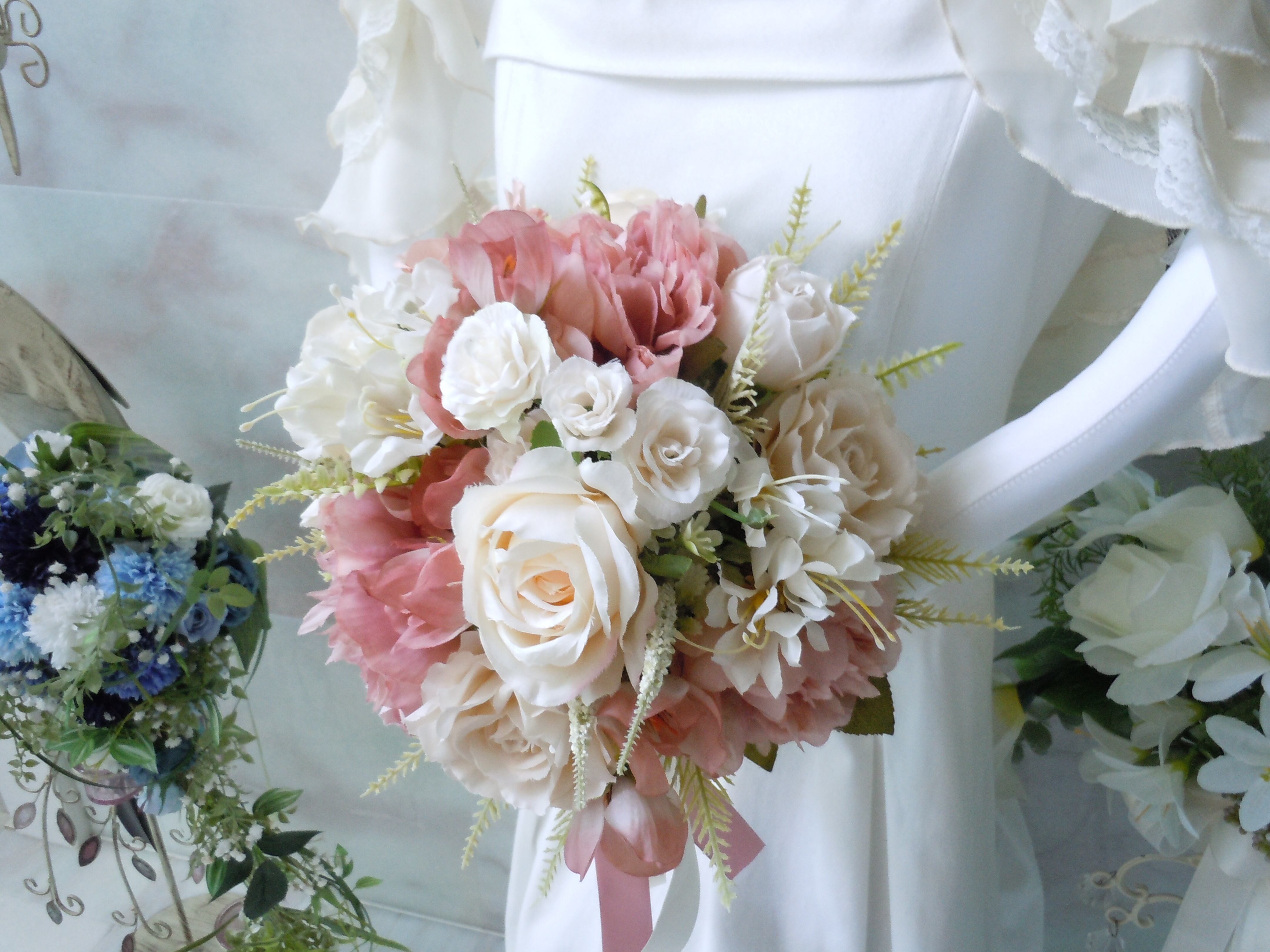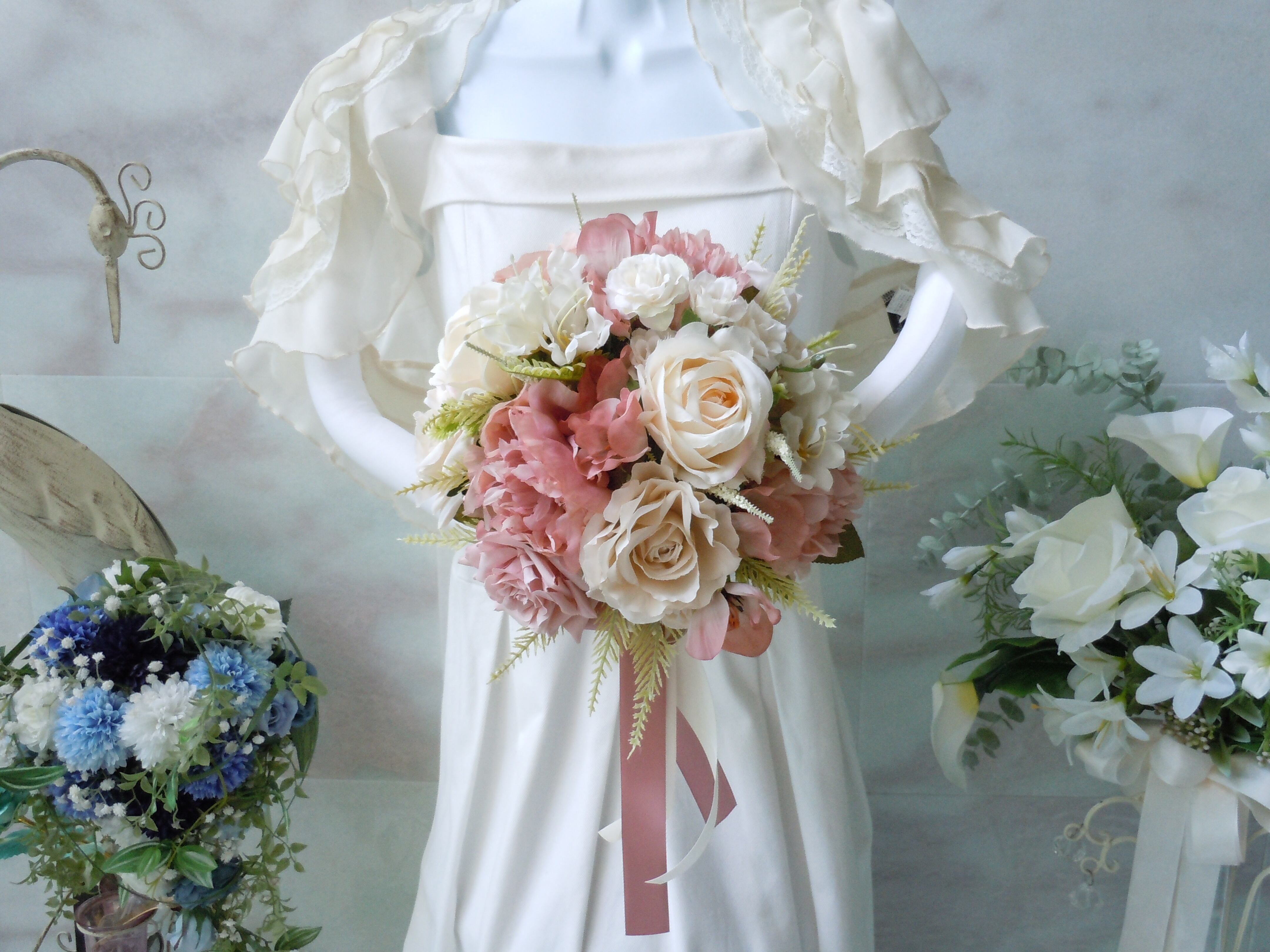 ピーチピンクやオフホワイトのローズやピオニーなど