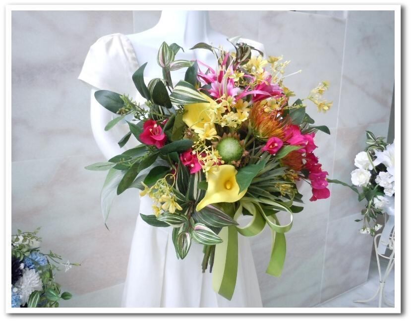 ◆南国フラワーのクラッチブーケ◆アーティフィシャルフラワー 造花*トロピカル ブーゲンビリア&カラー ガーデンウエディング サマーインテリア ワイルドフラワー アートフラワー 造花