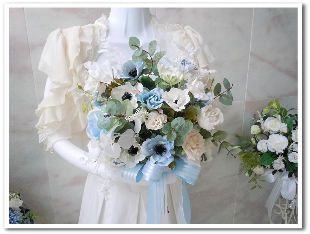◆アネモネ&ローズ*ブルー&ホワイト クラッチブーケ◆サムシングブルー パンパス ホワイトブーケ 前撮り インテリアブーケ 花束アレンジ アートフラワー 造花