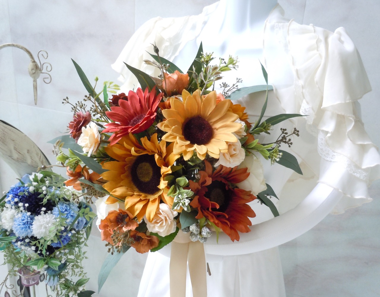 特価◆クラシカルカラー*ひまわり&ユーカリのクラッチブーケ*ブーケ◆ブラウンカラー サンフラワー ウエディングブーケ 前撮り アースカラー アートフラワー 造花 ブーケ