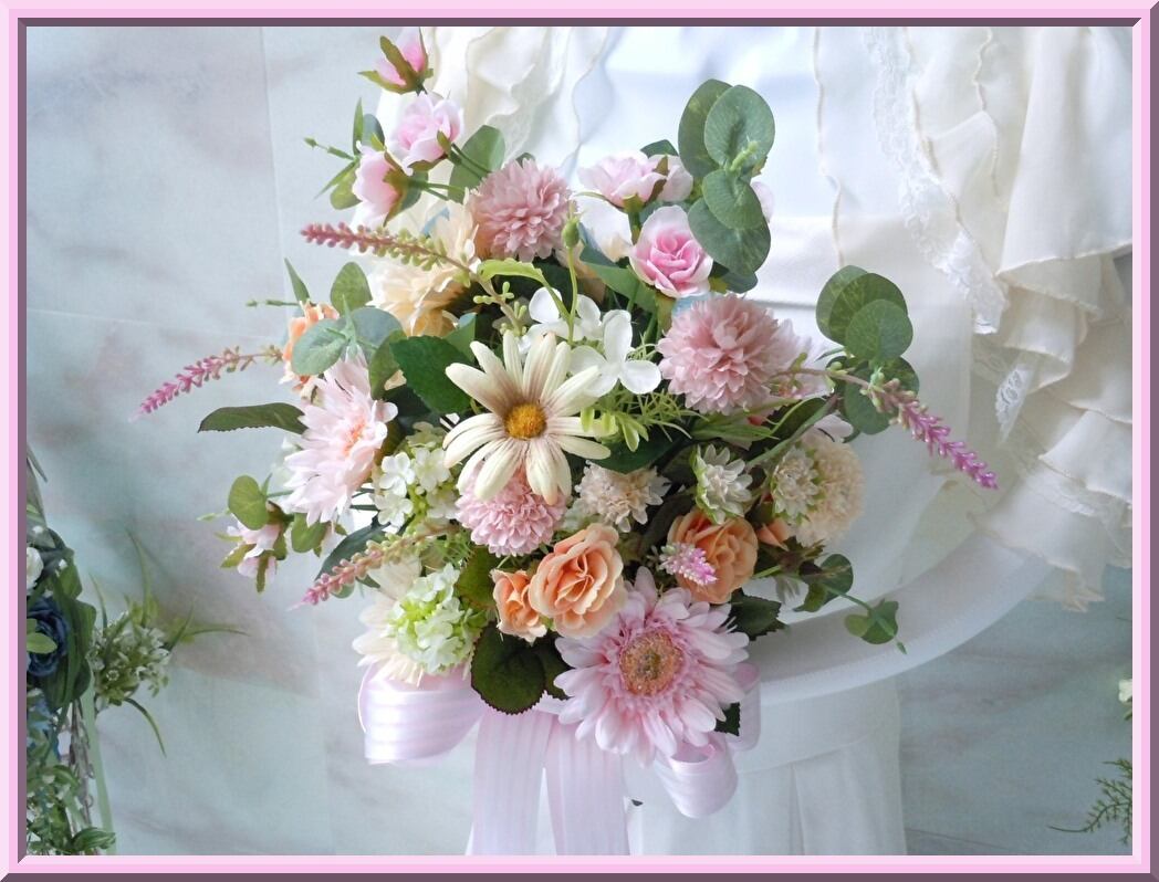 パステルカラーのピンクやクリームのガーベラでデザインした、