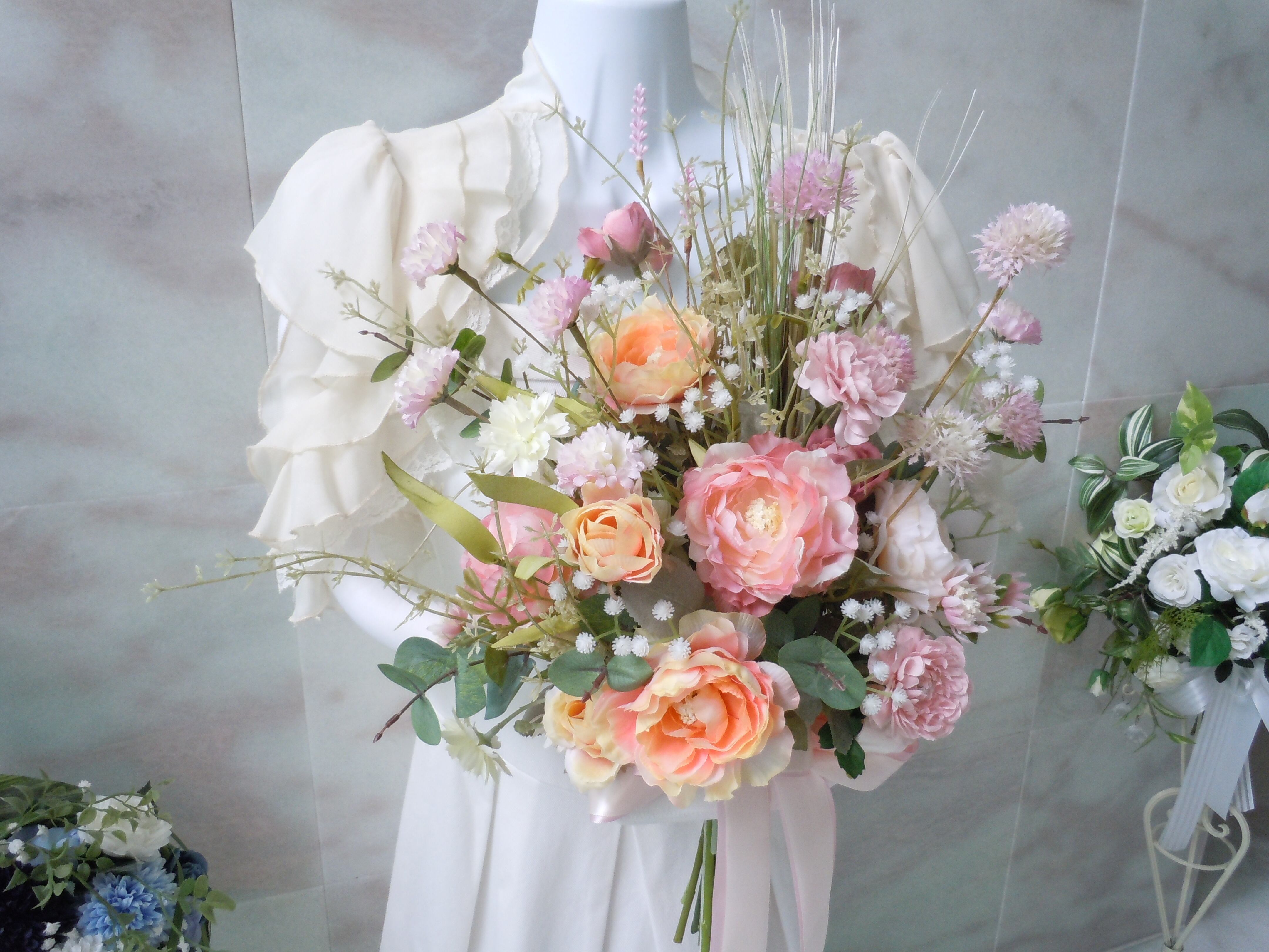 ◆ラナンキュラスの優雅なクラッチブーケ◆パステルカラー ニュアンスカラー クリーム バニラカラー・ピンク・イエロー ウエディングブーケ 前撮り シャビー 造花 アートフラワー | blue flower
