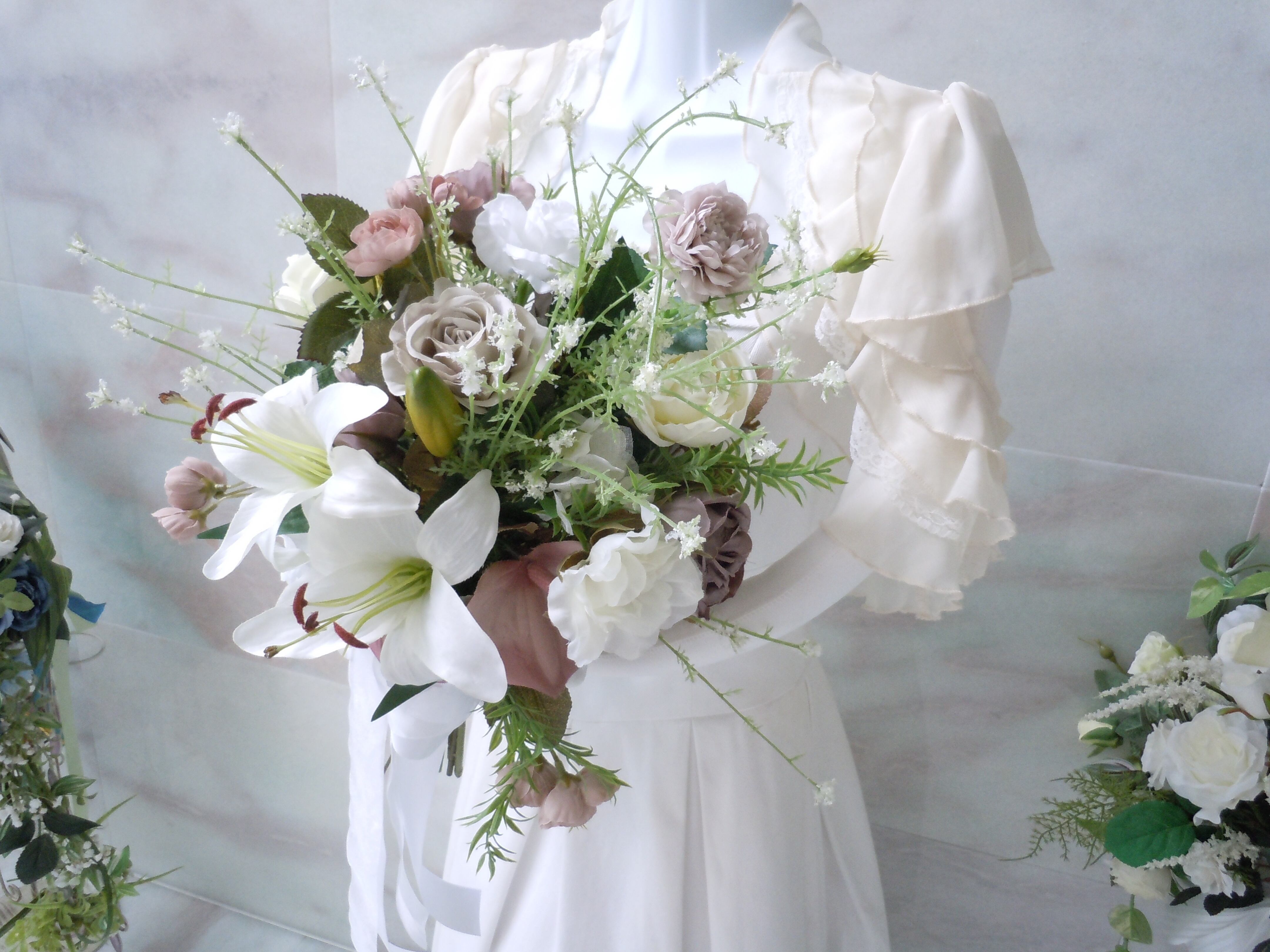 カサブランカの華やかさと、グレイッシュローズの柔らかな色合いが絶妙に調和し、